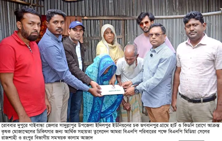 গাইবান্ধায় কিডনি রোগে আক্রান্ত কৃষক মোজাম্মেল হক (৪৮) পাশে দাঁড়িয়েছেন বিএনপি চেয়ারম্যান তারেক রহমান। রোববার বিকেলে আমরা বিএনপি পরিবারের পক্ষ থেকে মোজাম্মেলের পরিবারের হাতে নগদ অর্থ তুলে দেওয়া হয়৷ বিএনপি চেয়ারম্যানের মানবিক এই উদ্যােগে সহযোগিতা পাওয়া পরিবারটির পাশাপাশি আবেগ আপ্লুত হয়েছেন পুরো গ্রামের মানুষও।