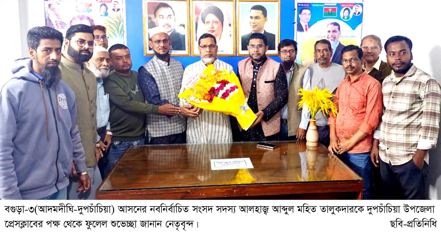 বগুড়া সংবাদ : বগুড়া-৩(আদমদীঘি-দুপচাঁচিয়া) আসনের নবনির্বাচিত সংসদ সদস্য আলহাজ্ব আব্দুল মহিত তালুকদারের সঙ্গে দুপচাঁচিয়া উপজেলা প্রেসক্লাবের নেতৃবৃন্দ ২৪ফেব্রæয়ারি মঙ্গলবার সন্ধ্যায় সান্তাহারস্থ তার কার্যালয়ে ফুলের শুভেচ্ছা জানিয়ে মতবিনিময় করেছেন। মতবিনিময় সভায় সংসদ সদস্য আব্দুল মহিত তালুকদার বলেন, দুপচাঁচিয়া এলাকায় চাঁদাবাজী, মাদক, জুয়া নির্মূলে দলমত নির্বিশেষে সকলকে সাথে নিয়ে কাজ করবো। এছাড়াও এলাকার রাস্তা, স্কুল, কলেজ, মাদ্রাসার উন্নয়ন করা হবে। এক্ষেত্রে সাংবাদিকদের সর্বাত্বক সহযোগিতা কামনা করছি এবং আপনাদের পত্রিকায় এসব বিষয়গুলো তুলে ধরবে হবে। মতবিনিময়কালে উপস্থিত ছিলেন উপজেলা প্রেসক্লাবের সভাপতি আবু কালাম আজাদ, সহসভাপতি এম,ডি শিমুল, শহীদুর রহমান, সাধারণ সম্পাদক গোলাম মুক্তাদির সবুজ, সহসাধারণ সম্পাদক আবু রায়হান, সাংগঠনিক সম্পাদক উজ্জ্বল চক্রবর্তী শিশির, দপ্তর সম্পাদক আরিফুর রহমান, সদস্য আবু আব্দুল্লাহ প্রিন্স, আজিজুল হক, আবু রায়হান চৌধুরী, কুতুবুল আলম, বেলাল হোসেন প্রমুখ।