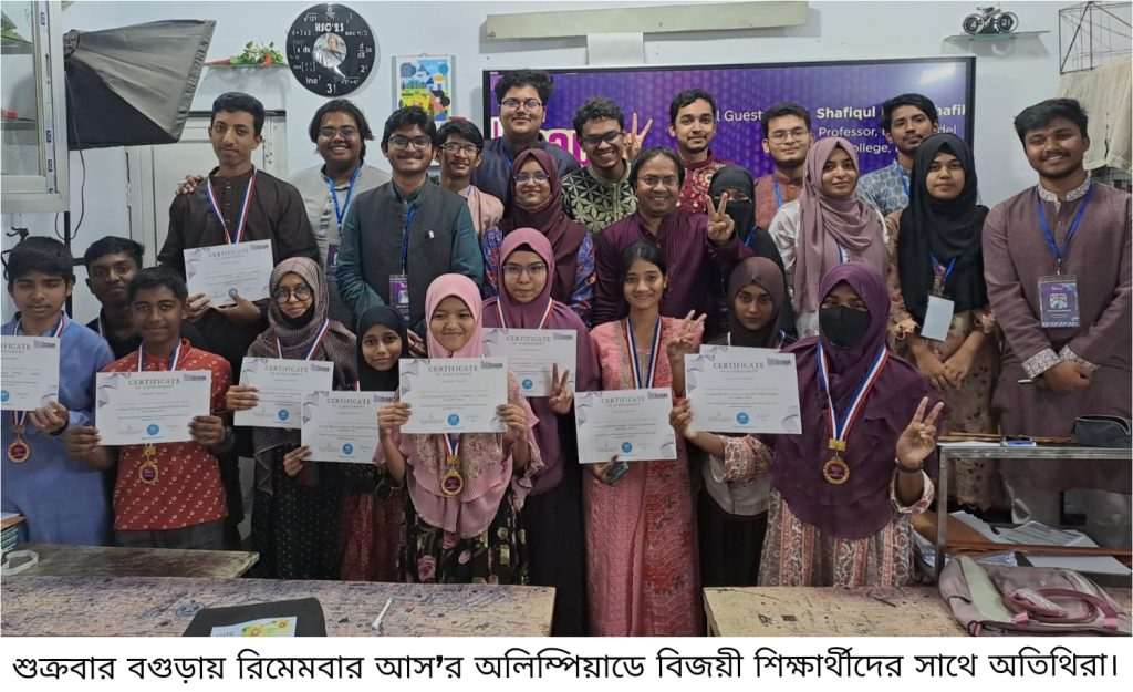 বগুড়া সংবাদ : রিমেমবার আস’র আয়োজনে বগুড়ায় মাইন্ডস্কেপ শিরোনামে সায়েন্স অলিম্পিয়াড, জেনারেল নলেজ ও লিটারেচার অলিম্পিয়াড ও সিনিয়র সায়েন্স অলিম্পিয়াড অনুষ্ঠিত হয়েছে। শুক্রবার বগুড়া শহরের হাকির মোড় এলাকায় শফিক ম্যাথ কেয়ারে দিনব্যাপী এ প্রতিযোগিতায় ৪টি বিভাগে ২ শতাধিক শিক্ষার্থী অংশ নেয়।