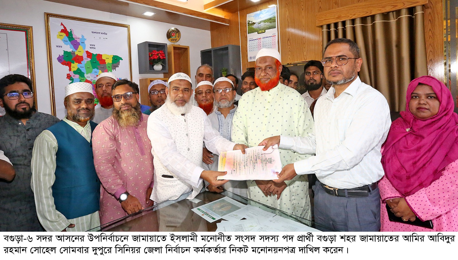 বগুড়া সংবাদ : বগুড়া-৬ সদর আসনের উপনির্বাচনে জামায়াতে ইসলামী মনোনীত সংসদ সদস্য পদ প্রার্থী জামায়াতের কেন্দ্রিয় কর্মপরিষদ সদস্য ও বগুড়া শহর জামায়াতের আমির আবিদুর রহমান সোহেল মনোনয়নপত্র দাখিল করেছেন। সোমবার দুপুরে তিনি জেলা নির্বাচন কর্মকর্তা ও রিটার্নিং কর্মকর্তা ফজলুল করিমের নিকট মনোনয়নপত্র দাখিল করেন। এসময় শহর জামায়াতের সেক্রেটারি অধ্যাপক আ.স.ম আব্দুল মালেক, সহকারি সেক্রেটারি অধ্যাপক রফিকুল আলম, অফিস সম্পাদক আব্দুল হামিদ বেগ, দাওয়া ও শিক্ষা সম্পাদক হেদাইতুল ইসলাম, যুব ও ক্রীড়া সম্পাদক আব্দুস ছালাম তুহিন, মিডিয়া সম্পাদক ইকবাল হোসেন, ইসলামী ছাত্রশিবির সরকারি আজিজুল হক কলেজ শাখার সভাপতি আব্দুল্লাহ আল মামুন সহ বিপুল সংখ্যক নেতাকর্মি উপস্থিত ছিলেন।