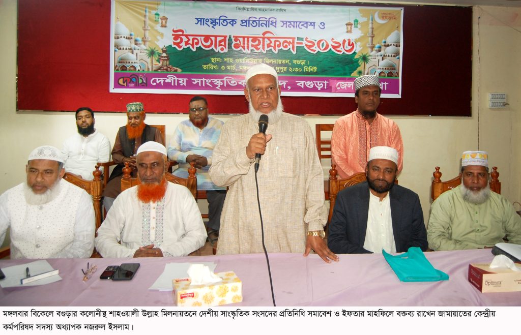 বগুড়া সংবাদ : মঙ্গলবার বিকেলে বগুড়ার কলোনীস্থ শাহওয়ালী উল্লাহ মিলনায়তনে দেশীয় সাংস্কৃতিক সংসদের সাংস্কৃতিক প্রতিনিধি সমাবেশ ও ইফতার মাহফিল সংগঠনের সভাপতি এনামুল হকের সভাপতিত্বে অনুষ্ঠিত হয়। অনুষ্ঠানে প্রধান অতিথি ছিলেন জামায়াতের কেন্দ্রীয় কর্মপরিষদ সদস্য অধ্যাপক নজরুল ইসলাম। অনুষ্ঠানে প্রধান আলোচক ছিলেন কেন্দ্রীয় কর্মপরিষদ সদস্য ও বগুড়া শহর জামায়াতের আমীর অধ্যক্ষ আবিদুর রহমান সোহেল। বিশেষ অতিথি ছিলেন জেলা জামায়াতের আমীর অধ্যক্ষ মাওলানা আব্দুল হক সরকার, সিনিয়র নায়েবে আমীর অধ্যাপক আব্দুল বাসেত, জেলা জামায়াতের সেক্রেটারী মাওলানা মানসুরুর রহমান। অনুষ্ঠান পরিচালনা করেন সেক্রেটারী গোলাম মোর্শেদ মিলন।