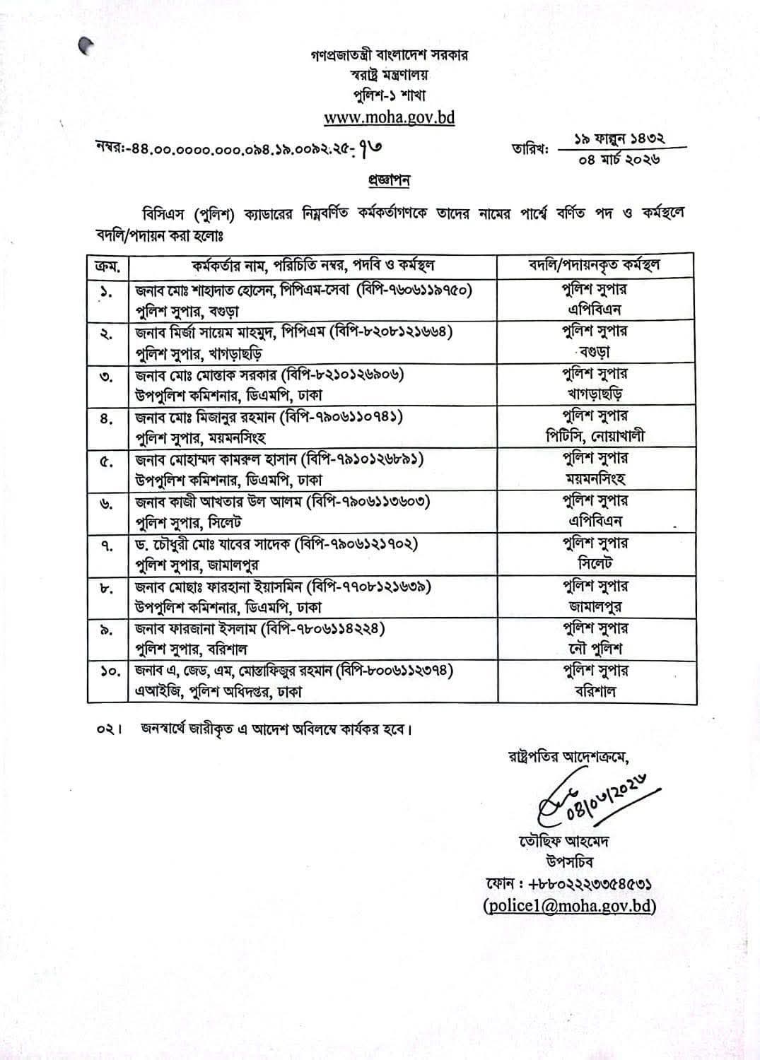 অপরদিকে, বগুড়ার বর্তমান পুলিশ সুপার মো. শাহাদাৎ হোসেন-কে বদলি করে আর্মড পুলিশ ব্যাটালিয়ন (এপিবিএন)-এর পুলিশ সুপার হিসেবে নিয়োগ দেওয়া হয়েছে।