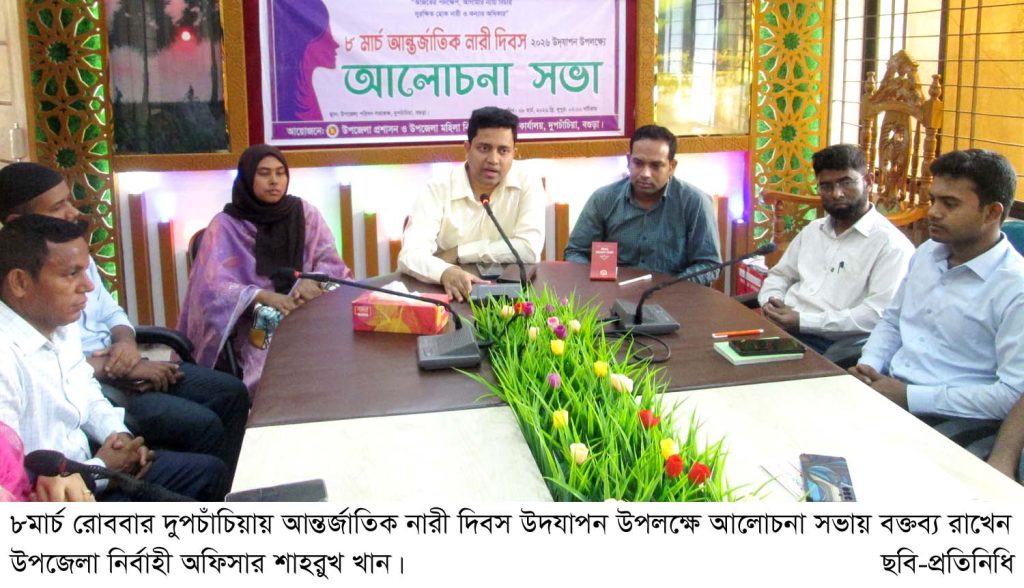 বগুড়া  সংবাদ :  ‘আজকের পদক্ষেপ, আগামীর ন্যায় বিচার সুরক্ষিত হোক নারী ও কন্যার অধিকার’- এই প্রতিপাদ্যকে সামনে রেখে দুপচাঁচিয়ায় উপজেলা প্রশাসন ও উপজেলা মহিলা বিষয়ক কার্যালয়ের আয়োজনে আন্তর্জাতিক নারী দিবস উদযাপিত হয়েছে। এ উপলক্ষে ৮মার্চ রোববার দুপুরে উপজেলা প্রশাসন সভাকক্ষে উপজেলা নির্বাহী অফিসার শাহরুখ খানের সভাপতিত্বে এক আলোচনা সভা অনুষ্ঠিত হয়। সভায় বক্তব্য রাখেন সহকারী কমিশনার(ভূমি) তৌহিদুল ইসলাম, উপজেলা বিএনপির সভাপতি একেএম মনিরুল ইসলাম খান স্বপন, উপজেলা প্রাণি সম্পদ কর্মকর্তা জাফরিন রহমান, উপজেলা মহিলা বিষয়ক কর্মকর্তা(অঃদাঃ) জান্নাতুল ফেরদৌস, দুপচাঁচিয়া মহিলা কলেজের উপাধ্যক্ষ মনোয়ারা বেগম, ইউপি চেয়ারম্যান সাখাওয়াত হোসেন মল্লিক, দুপচাঁচিয়া প্রেসক্লাবের সাধারণ সম্পাদক কেএম বেলাল, সাংবাদিক অরবিন্দ কুমার দাস, সফল নারী উদ্যোক্তা আসমাউল হুসনা দীনা, জান্নাতুল ফেরদৌসী প্রমুখ। সভায় সরকারী বিভিন্ন দপ্তরের কর্মকর্তাগণ উপস্থিত ছিলেন। একইদিন উপজেলা পিএফজি ও ওয়েভ এর আয়োজনে এদিবসটি পালন করা হয়।