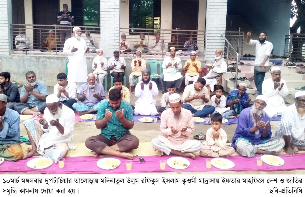 বগুড়া সংবাদ : দুপচাঁচিয়া উপজেলার তালোড়ায় ইসলাম নগর মদিনাতুল উলুম রফিকুল ইসলাম ক্বওমী মাদরাসার আয়োজনে ইফতার মাহফিল অনুষ্ঠিত হয়েছে। ১০মার্চ মঙ্গলবার বিকালে মাদ্রাসা চত্বরে ইফতার মাহফিল পূর্ব এক আলোচনা সভা মাদ্রাসা পরিচালনা কমিটির সিনিয়র সহসভাপতি আলহাজ্ব মোশারফ হোসেন মুন্সি সেলিম এর সভাপতিত্বে অনুষ্ঠিত হয়। সভায় বক্তব্য রাখেন মাদ্রাসার প্রধান উপদেষ্টা সমাজ সেবক আলহাজ্ব নবিউল ইসলাম নয়ন,সহসভাপতি ও তালোড়া পৌরসভার সাবেক মেয়র আব্দুল জলিল খন্দকার, মাদ্রাসার মুহতামিম হাফেজ মাও:মুফতি এমদাদুল হক প্রমুখ। এ সময় রাজনৈতিক দলের নেতৃবৃন্দ ও বিপুল সংখ্যক মুসল্লী উপস্থিত ছিলেন। শেষে দেশ, জাতী ও মুসলিম উম্মাহর শান্তি কামনায় দোয়া করা হয়। দোয়া পরিচালনা করেন মাও: দেলোয়ার হোসেন। প্রসঙ্গতঃ সমাজ সেবক রুহুল ইসলাম ২০১১সালে এ মাদ্রাসাটি প্রতিষ্ঠা করেন।