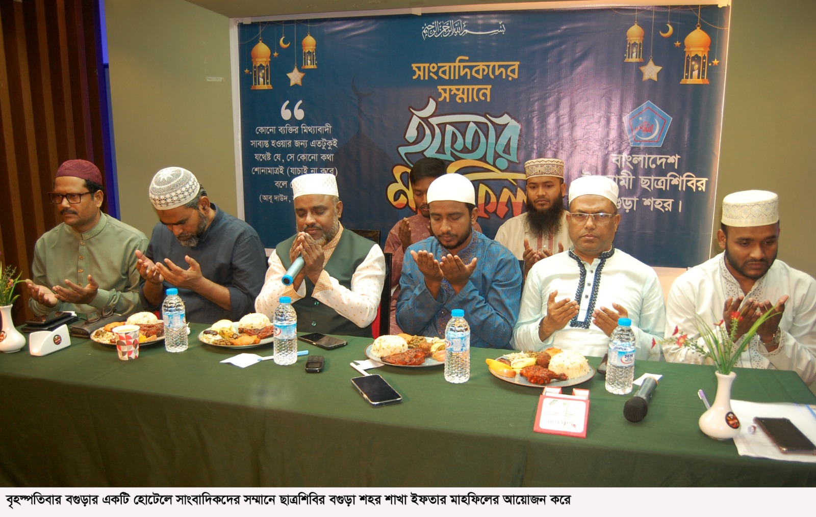 বগুড়া সংবাদ : বৃহস্পতিবার বিকেলে বগুড়ার একটি হোটেলে সাংবাদিকদের সম্মানে ছাত্রশিবির বগুড়া শহর শাখা ইফতার মাহফিলের আয়োজন করে। ইফতার মাহফিলে বক্তব্য রাখেন শহর সেক্রেটারী শফিকুল ইসলাম শফিক। ছাত্রশিবিরের প্রচার সম্পাদক মনিরুজ্জামান লিটনের পরিচালনায় অনুষ্ঠানে বক্তব্য রাখেন ছাত্রশিবিরের সাবেক সভাপতি অধ্যাপক আব্দুস সালাম তুহিন, বগুড়া প্রেসক্লাবের সেক্রেটারী কালাম আজাদ, বগুড়া টেলিভিশন রিপোর্টার্স ইউনিটির সভাপতি মোহন আকন্দ, সাংবাদিক ইউনিয়ন বগুড়ার সেক্রেটারী এস এম আবু সাঈদ। অনুষ্ঠানে আরো উপস্থিত ছিলেন ছাত্রশিবির নেতা আল জাবের হক্কানী, সিনিয়ার সাংবাদিক মতিউল ইসলাম সাদি, মীর্জা সেলিম রেজা, প্রেসক্লাবের সহ সভাপতি রাহাত রিটু, দৈনিক সাতমাথার বার্তা সম্পাদক এফ শাহজাহান প্রমুখ। অনুষ্ঠানে অধ্যাপক আব্দুস সালাম তুহিন বলেন, আগামীর দেশ গঠনে ছাত্রশিবিরকে মেধা যোগ্যতায় আরো বলিয়ান হয়ে গড়ে উঠতে হবে ও দেশ জাতির কল্যানে কাজ করতে হবে। ছাত্রশিবির সেক্রেটারী শফিকুল ইসলাম বলেন, ছাত্রশিবির শিক্ষাঙ্গনে মাদক ও চাঁদাবাজীসহ সকল অপকর্ম বন্ধ করে সুন্দর ক্যাম্পাস তৈরী করতে চায়। সব সময় ছাত্রছাত্রীদের কল্যাণে কাজ করে বলেই সাধারন শিক্ষার্থীরা শিবিরের পক্ষে অবস্থান নিয়েছে। তিনি শিক্ষা বান্ধব শিক্ষাঙ্গন গড়ে তুলতে সকলের সহযোগিতা কামনা করেন।