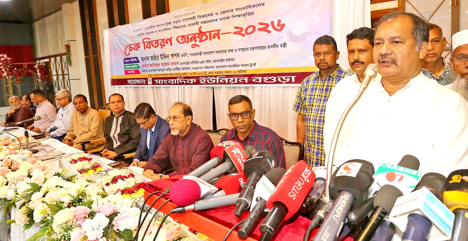 শুক্রবার (১৩ মার্চ) বেলা সাড়ে ১১টার দিকে বগুড়া শহরের করতোয়া কনভেনশন সেন্টারে বাংলাদেশ সাংবাদিক কল্যাণ ট্রাস্ট আয়োজিত রাজশাহী বিভাগের সাত জেলার সাংবাদিকদের আর্থিক অনুদান এবং সাংবাদিক পরিবারের মেধাবী সন্তানদের শিক্ষাবৃত্তির চেক বিতরণ অনুষ্ঠানে প্রধান অতিথির বক্তব্যে তিনি এসব কথা বলেন।
