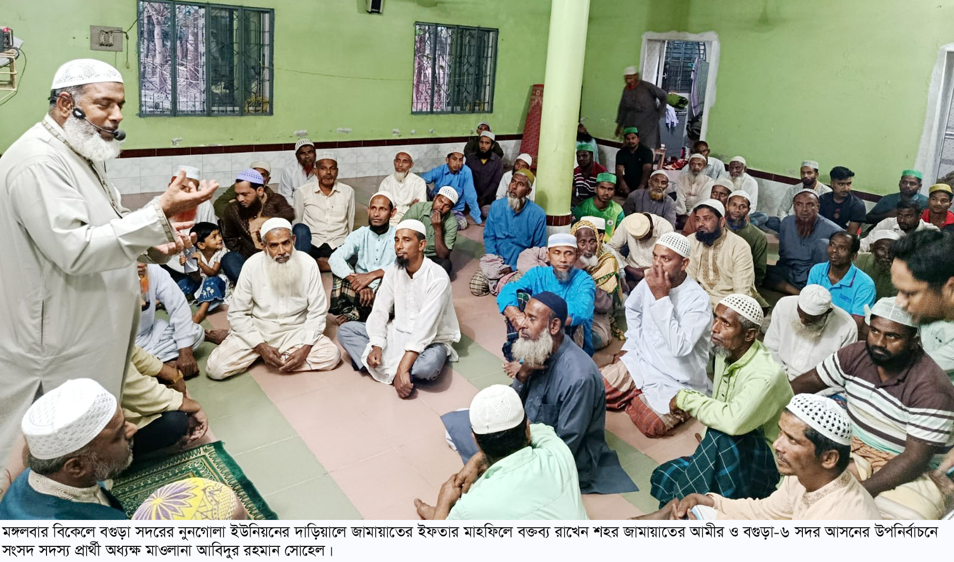 বগুড়া সংবাদ : মঙ্গলবার বিকেলে বগুড়া সদরের নুনগোলা ইউনিয়নের দাড়িয়াল বাজার এলাকায় জামায়াতের ইফতার মাহফিল ইউনিয়ন আমীর আফজাল হোসেনের সভাপতিত্বে অনুষ্ঠিত হয়। ইউনিয়ন সেক্রেটারী শরিফুল ইসলামের পরিচালনায় ইফতার মাহফিলে বক্তব্য রাখেন শহর জামায়াতের আমীর ও বগুড়া-৬ সদর আসনের উপনির্বাচনে সংসদ সদস্য প্রার্থী অধ্যক্ষ মাওলানা আবিদ;ুর রহমান সোহেল। বিশেষ অতিথি ছিলেন শহর জামায়াতের যুব ও ক্রীড়া সম্পাদক অধ্যাপক আব্দুস সালাম তুহিন, প্রচার সেক্রেটারী অধ্যক্ষ ইকবাল হোসেন, তারেক মোস্তফা ফকির, জিয়াউর রহমান। মাহফিলে অধ্যক্ষ আবিদুর রহমান সোহেল বলেন, আগামী ৯ এপ্রিল নির্বাচনে বিজয়ী হলে বগুড়া সদর বাসী একটি কল্যাণ সমাজ উপহার পাবে। কুরআনের সমাজ প্রতিষ্ঠার মাধ্যমে ঘুষ দুর্নীতি ক্ষুধা দারিদ্র কে বিদায় জানাননো হবে। ইনশাআল্লাহ ন্যায়-ইনসাফের নতুন বাংলাদেশ গড়ে তোলা হবে। তিনি আবারো দাড়িপাল্লায় ভোট দিতে সকলের প্রতি আহবান জানান।