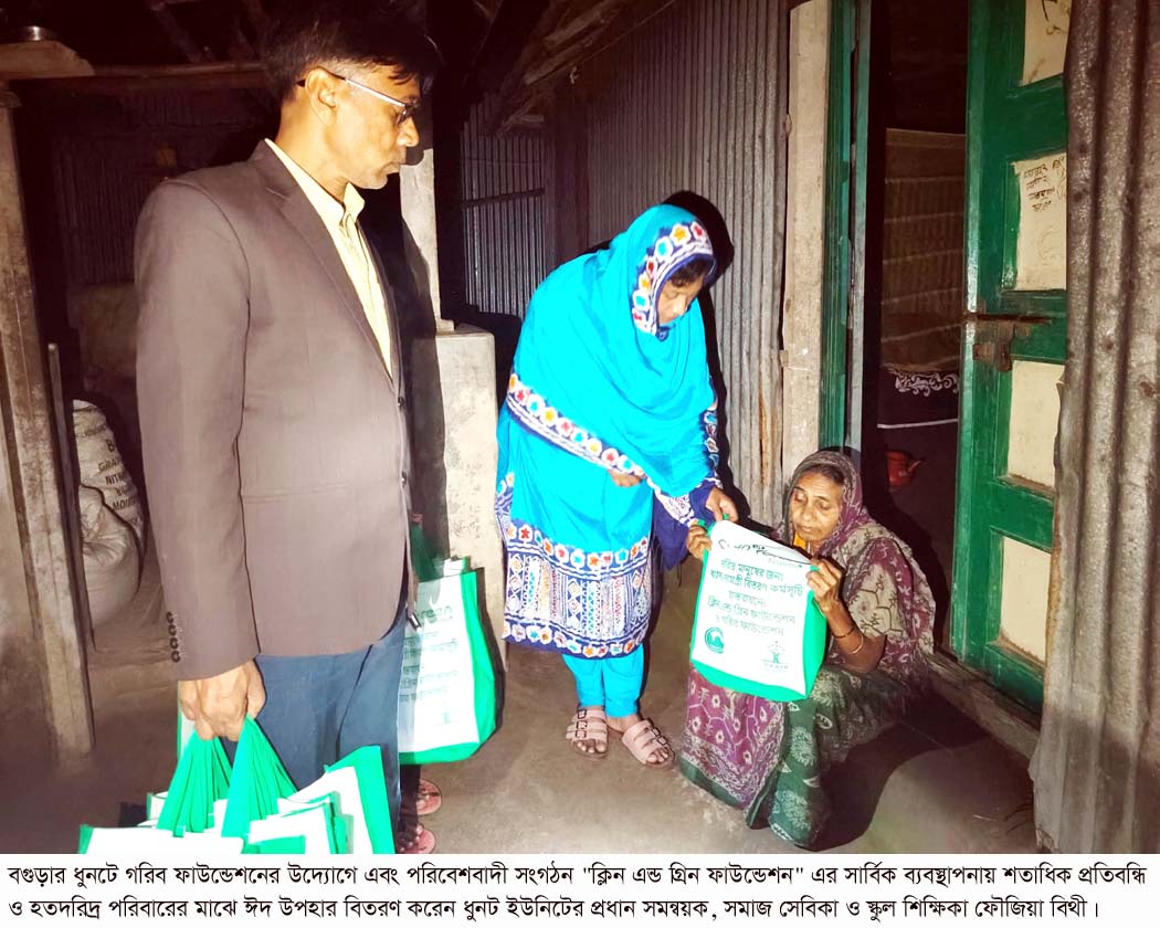 ক্লিন এন্ড গ্রিন ফাউন্ডেশনের সামাজিক আন্দোলন ক্লিন গ্রিন বাংলাদেশ (সংক্ষেপে সিজিবি) বগুড়ার ধুনট ইউনিটের প্রধান সমন্বয়ক, সমাজ সেবিকা ও স্কুল শিক্ষিকা ফৌজিয়া বিথীর নেতৃত্বে স্বেচ্ছাসেবীগণ রাতের আঁধারে বাড়ি বাড়ি গিয়ে গরিব ফাউন্ডেশনের এসব ঈদ উপহার পৌঁছে দেন।