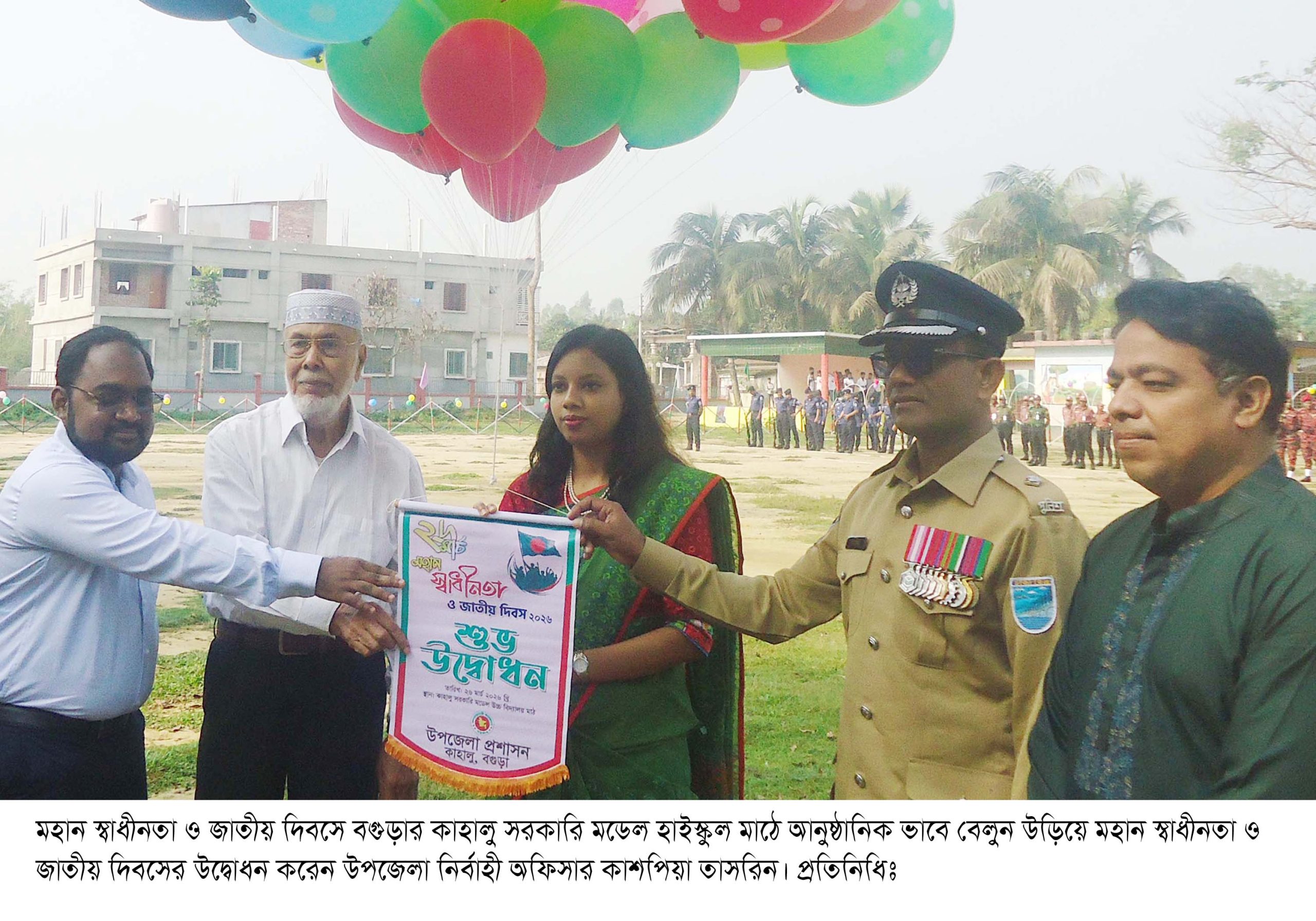 ক্যাপসনঃ মহান স্বাধীনতা ও জাতীয় দিবসে বগুড়ার কাহালু সরকারি মডেল হাইস্কুল মাঠে আনুষ্ঠানিক ভাবে বেলুন উড়িয়ে মহান স্বাধীনতা ও জাতীয় দিবসের উদ্বোধন করেন উপজেলা নির্বাহী অফিসার কাশপিয়া তাসরিন। প্রতিনিধিঃ