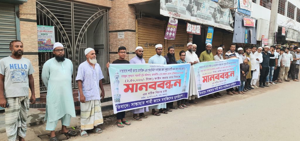 ভ্রাম্যমান আদালতের মাধ্যমে জরিমানা করার প্রতিবাদে… সান্তাহার শাহী জামে মসজিদের মুসল্লিবৃন্দের উদ্যোগে মানববন্ধন অনুষ্ঠিত