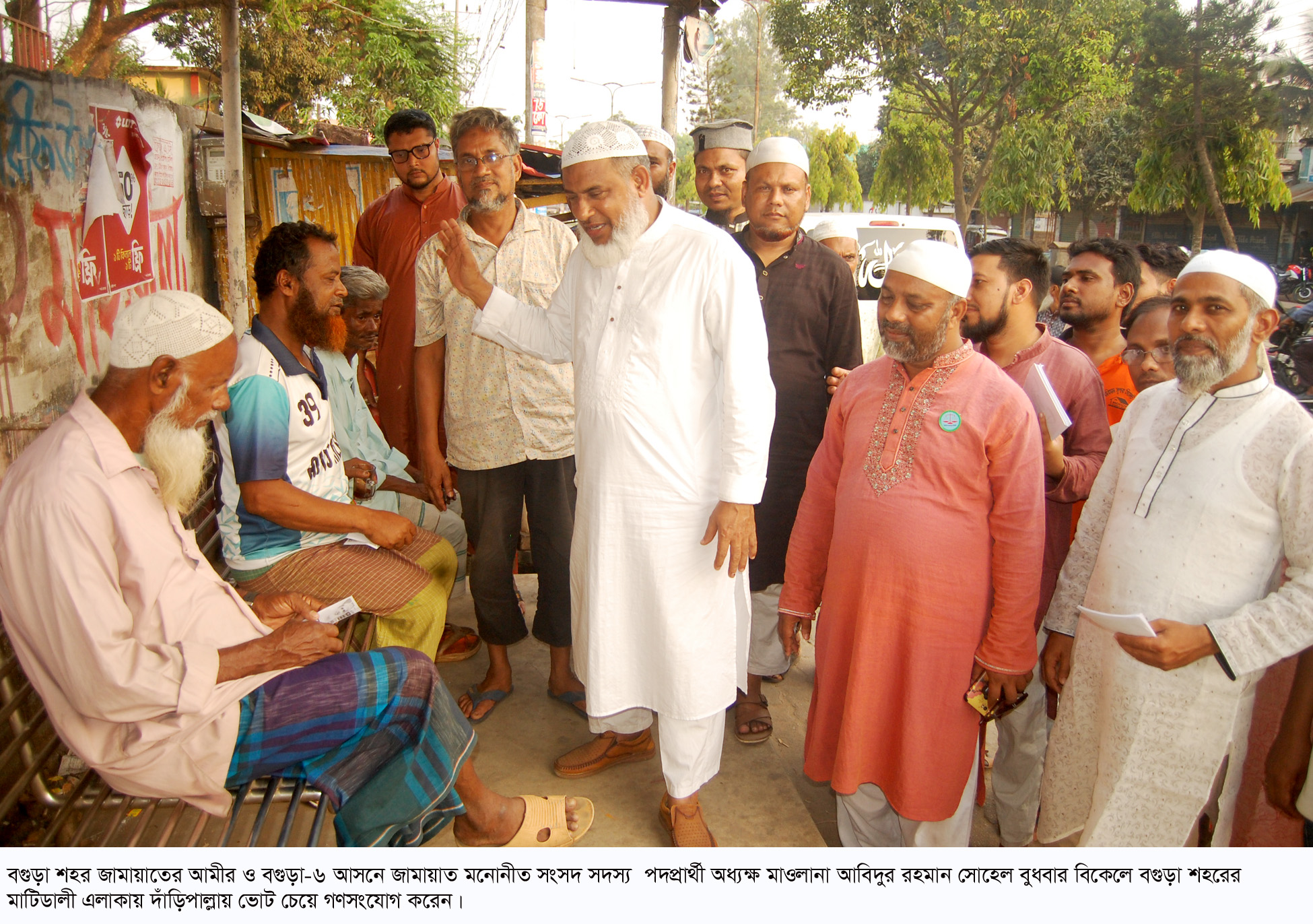 বগুড়া সংবাদ : বগুড়া শহর জামায়াতের আমীর ও বগুড়া-৬ আসনের উপ নির্বাচনে সংসদ সদস্য পদ প্রার্থী অধ্যক্ষ মাওলানা আবিদুর রহমান সোহেল বুধবার বিকেলে মাটিডালী বাজার, বিমান মোড়, বারোপুর বাজার ধরমপুর ওলিরবাজার এলাকায় ব্যাপক গণসংযোগ করেন। মাটিডালী বিমান মোড়ে এক পথসভায় অধ্যক্ষ আবিদুর রহমান সোহেল বলেন, সমাজে কুরআন প্রতিষ্ঠার জন্য আপনারা আমাকে আগেও ভোট দিয়েছেন, আবারো দিবেন। নির্বাচিত হলে বৈষম্যহীন, দুর্নীতি, দু:শাসন, মাদক ও অপরাধমুক্ত এক নতুন সমাজ উপহার দিবো। সমাজে শান্তি ও ন্যায়বিচার প্রতিষ্ঠা হলে কেউ মাদকের আশেপাশে যাবেনা। আমরা এমন এক সমাজ কায়েম করতে চাই যে সমাজের মানুষের সকল ধরনের মৌলিক অধিকারের নিশ্চিয়তা থাকবে। নির্বাচিত হলে খেলাধুলার পরিবেশ নিশ্চিত করতে মাটিডালী সহ বগুড়া শহরে ৩/৪ মিনি স্টেডিয়াম নির্মাণ করা হবে। এ সময় উপস্থিত ছিলেন জামায়াত নেতা অধ্যাপক আব্দুর রাজ্জাক, মাওলানা জাহিদুর রহমান, শ্রমিক কল্যাণ ফেডারেশন বগুড়া শহর সভাপতি আজগর আলী, শহর প্রচার সম্পাদক অধ্যক্ষ ইকবাল হোসেন, ১৭ নং ওয়ার্ড আমীর আব্দুর রউফ পারভেজ, সেক্রেটারী আসলাম হোসেন, পরিবহন শ্রমিক নেতা এজাজ আহম্মেদ আসলাম উপস্থিত ছিলেন। এর আগে সকালে নিশিন্দারা ইউনিয়নের ল্যাংড়া বাজার, বিএমএ শাহীন কলেজ এলাকায় গণসংযোগ করেন। এ সময় শহীন কলেজের উপস্থিত শত শত অভিভাবকরা হাত নেড়ে শুভেচ্ছা জানান। এ সময় উপস্থিত ছিলেন, নিশিন্দারা ইউনিয়ন কেয়ারটেকার এডভোকেট নুরুল ইসলাম আকন্দ, এডভোকেট সিরাজুল হক, ইউনিয়ন আমীর প্রভাষক আব্দুল হালিম, সেক্রেটারী মাওলানা লুৎফর রহমান, আব্দুল বাসেদ, মাওলানা আহাদুল ইসলাম প্রমুখ। অধ্যক্ষ আবিদুর রহমান সোহেল বাড়ী বাড়ী গিয়ে ভোট প্রার্থনা করার জন্য সকল নেতা কর্মীদের প্রতি আহবান জানান।