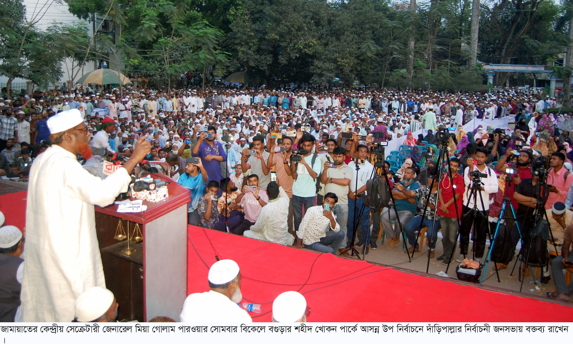 এর আগে তিনি বগুড়া সদরের বাঘোপাড়ায় এক নির্বাচনী জনসভায় বক্তব্য রাখেন। বিএনপি সরকার গঠন করেই দেশে রাজনৈতিক সংকট সৃষ্টি করেছে উল্লেখ করে বাংলাদেশ জামায়াতে ইসলামীর সেক্রেটারী জেনারেল অ্যধাপক মিয়া গোলাম পরওয়ার বলেছেন, জুলাই শহীদদের রক্তের ওপর দাঁড়িয়ে বর্তমান সংসদ গঠিত হয়েছে। আপনারা সরকার গঠন করেছেন এবার জুলাই সনদের ভিত্তিতে দেশ পরিচালনায় জাতীয় ঐক্য গড়ে তুলুন। দিল্লীর কথায় দেশের ভতরে বিভেদ সৃষ্টি করবেন না। তিনি সোমবার বিকেলে বগুড়া সদরের বাঘোপাড়া শহীদ দানেশ উদ্দিন স্কুল এন্ড কলেজ মাঠে উপনির্বাচনী গণসমাবেশে প্রধান অতিথির বক্তব্যে একথা বলেন। বগুড়া-৬ আসনের উপনির্বাচনে জামায়াতসহ ১১ দল মনোনীত প্রার্থী ও বগুড়া শহর জামায়াতের আমির অধ্যক্ষ আবিদুর রহমান সোহেলের সভাপতিত্বে গণসমাবেশে বিশেষ অতিথি ছিলেন জামায়াতের কেন্দ্রিয় নির্বাহী পরিষদ সদস্য অধ্যক্ষ শাহাবুদ্দিন, কেন্দ্রিয় কর্মপরিষদ সদস্য ও বগুড়া অঞ্চলের সহকারি পরিচালক অধ্যাপক নজরুল ইসলাম, বাংলাদেশ শ্রমিক কল্যাণ ফেডারেশনের সহসভাপতি গোলাম রব্বানী, এনসিপির মূখ্য সংগঠক সারজিস আলম, জাতীয় নারী শক্তি সদস্য সচিব ও এনসিপির যুগ্ম মূখ্য সংগঠন, দক্ষিণাঞ্চল ডা: মাহমুদা আলম মিতু ও বগুড়া জেলা জামায়াতের আমির অধ্যক্ষ আব্দুল হক সরকার।