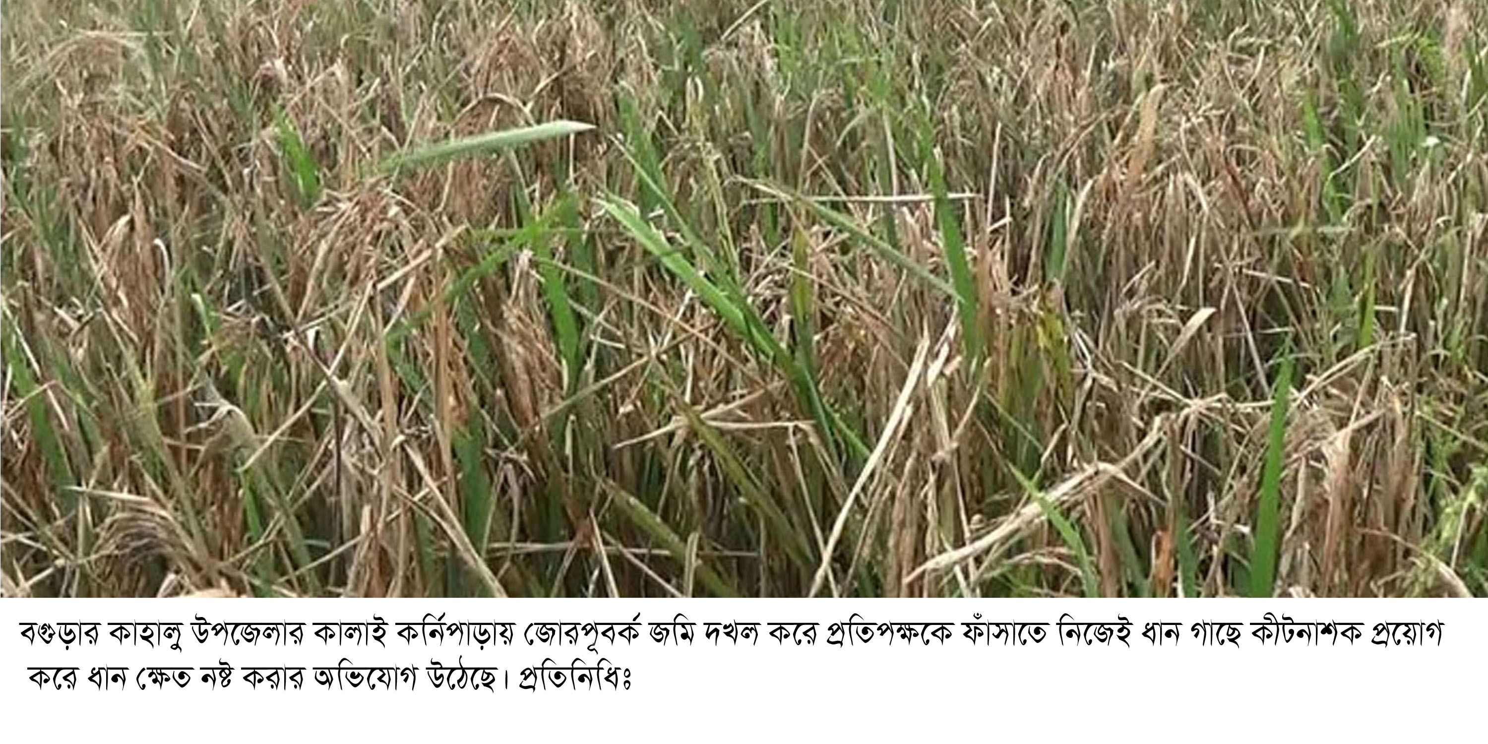 বগুড়া সংবাদ : বগুড়ার কাহালু উপজেলার কালাই কর্নিপাড়া গ্রামে জমি দখলকে কেন্দ্র করে প্রতিপক্ষকে ফাঁসাতে ধানক্ষেতে কীটনাশক প্রয়োগের অভিযোগ উঠেছে। এ ঘটনায় ভুক্তভোগী ছমির উদ্দিন ওরফে কুদ্দুস গত ২৫ এপ্রিল কাহালু থানায় লিখিত অভিযোগ দায়ের করেছেন।