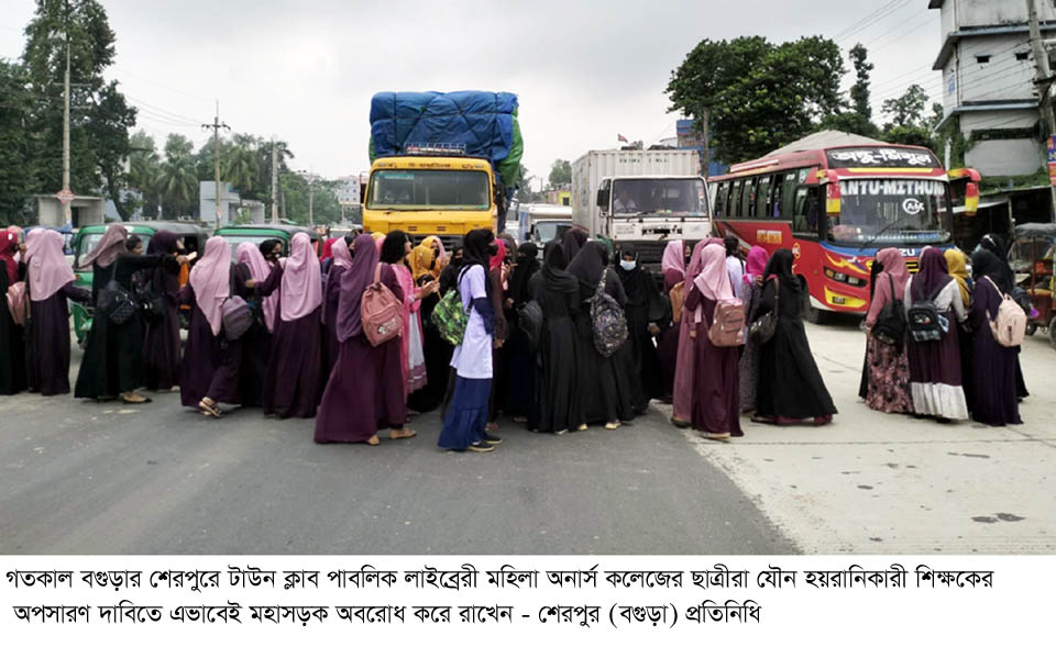 বগুড়ার শেরপুরে টাউন ক্লাব পাবলিক লাইব্রেরী মহিলা অনার্স কলেজের কৃষি শিক্ষক মাহবুবুর রহমানের বিরুদ্ধে ছাত্রীদের যৌন হয়রানির অভিযোগ উঠেছে। এই ঘটনায় ভুক্তভোগী ছাত্রীদের পক্ষ থেকে উপজেলা নির্বাহী কর্মকর্তার নিকট একটি লিখিত অভিযোগ করা হয়। কিন্তু অভিযুক্ত শিক্ষকের বিরুদ্ধে কোনো পদক্ষেপ না নেওয়ায় কলেজের শিক্ষার্থীরা বিক্ষুব্ধ হয়ে উঠেছেন। এমনকি তাঁরা ওই শিক্ষকসহ কলেজের ভারপ্রাপ্ত অধ্যক্ষের অপসারণ দাবিতে রবিবার (২৯ সেপ্টেম্বর) দুপুরে উপজেলা পরিষদের সামনে ঢাকা-বগুড়া মহাসড়ক অবরোধ করে বিক্ষোভ করেন। ঘন্টাব্যাপি ওই কর্মসূচি চলাকালে মহাসড়কের উভয়পাশে অসংখ্য যানবাহন আটকে প্রায় এক কিলোমিটার জুড়ে তীব্র যানজটের সৃষ্টি হয়। একপর্যায়ে পুলিশ ঘটনাস্থলে এসে আইনগত সহযোগিতা দেওয়ার আশ^াস দিয়ে বিক্ষুব্ধ ছাত্রীদের শান্ত করেন। এরপর পরিস্থিতি নিয়ন্ত্রণে আসে এবং যান চলাচল স্বাভাবিক হয়।