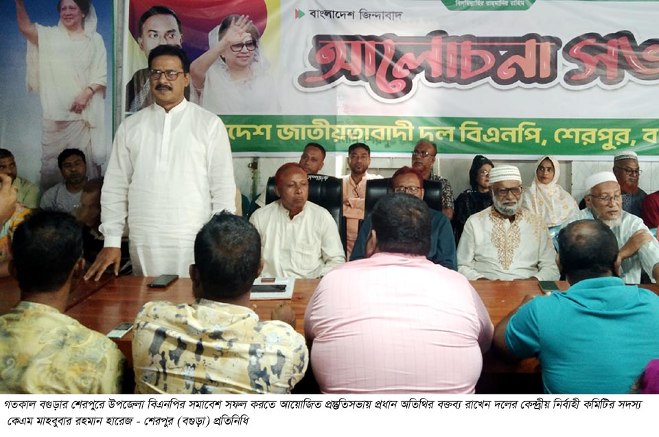 উপজেলা বিএনপির সভাপতি শহিদুল ইসলাম বাবলুর সভাপতিত্বে প্রধান অতিথির বক্তৃতায় বিএনপির কেন্দ্রীয় নির্বাহী কমিটির সদস্য কেএম মাহবুবার রহমান হারেজ বলেন, ফ্যাসিস্ট আওয়ামীলীগের দোসররা কিন্তু বসে নেই। তারা দেশ ও জাতির বিরুদ্ধে নানামুখি ষড়যন্ত্রে লিপ্ত। এমনকি বর্তমান অন্তবর্তীকালিন সরকারকেও বেকায়দায় ফেলতে চান তারা। তাই তাদের সব ষড়যন্ত্র রুখে দিতে হবে। এজন্য সব ভেদাভেদ ভুলে দলকে সুশৃঙ্খল ও সুসংগঠিত করতে ঐক্যবদ্ধভাবে দলীয় নেতাকর্মীদের কাজ করার আহবান জানান তিনি। বিএনপি নেতা হারেজ আরো বলেন, উপজেলার দশটি ইউনিয়নের সভাপতি-সম্পাদকরা বিশাল বিশাল মিছিল নিয়ে সমাবেশে যোগ দিতে হবে। যাতে করে ওইদিন মিছিলের নগরীতে পরিনত হয় শেরপুর। এই সমাবেশ থেকে আগামি জাতীয় সংসদ নির্বাচন সম্পর্কে দলীয় নেতাকর্মীদের বিশেষ নির্দেশনা দেবেন কেন্দ্র ও জেলার সিনিয়র নেতারা।