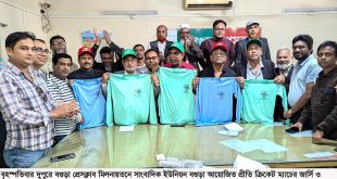 বগুড়া সংবাদ : সাংবাদিক ইউনিয়ন বগুড়া (জেইউবি) এর উদ্যোগে আগামী ৭ ডিসেম্বর শনিবার শহীদ চান্দু স্টেডিয়ামে আয়োজিত প্রীতি ক্রিকেট ম্যাচের জার্সি ও ক্যাপ উন্মোচন করা হয়েছে। বৃহস্পতিবার দুপুরে বগুড়া প্রেসক্লাব মিলনায়তনে এ উপলক্ষ্যে এক অনুষ্ঠানের আয়োজন করা হয়। সাংবাদিক ইউনিয়ন বগুড়া’র সভাপতি গনেশ দাস এর সভাপতিত্বে এবং সাধারন সম্পাদক এস …